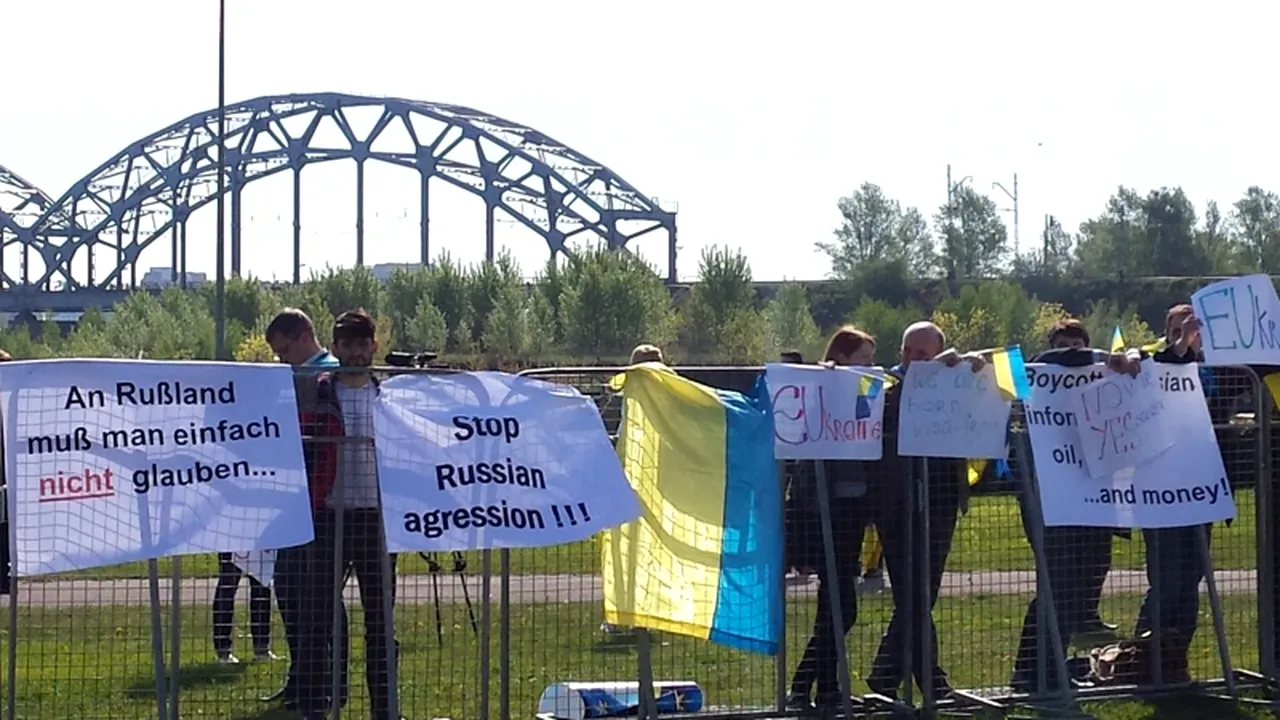 Cu câteva ore înainte ca liderii Uniunii Europene să încheie Summitul Parteneriatului Estic de la Riga, un grup de protestatari au afișat mai multe bannere de susținere pentru Georgia, Ucraina și Republica Moldova, exprimându-și totodată dezacordul față de Rusia.