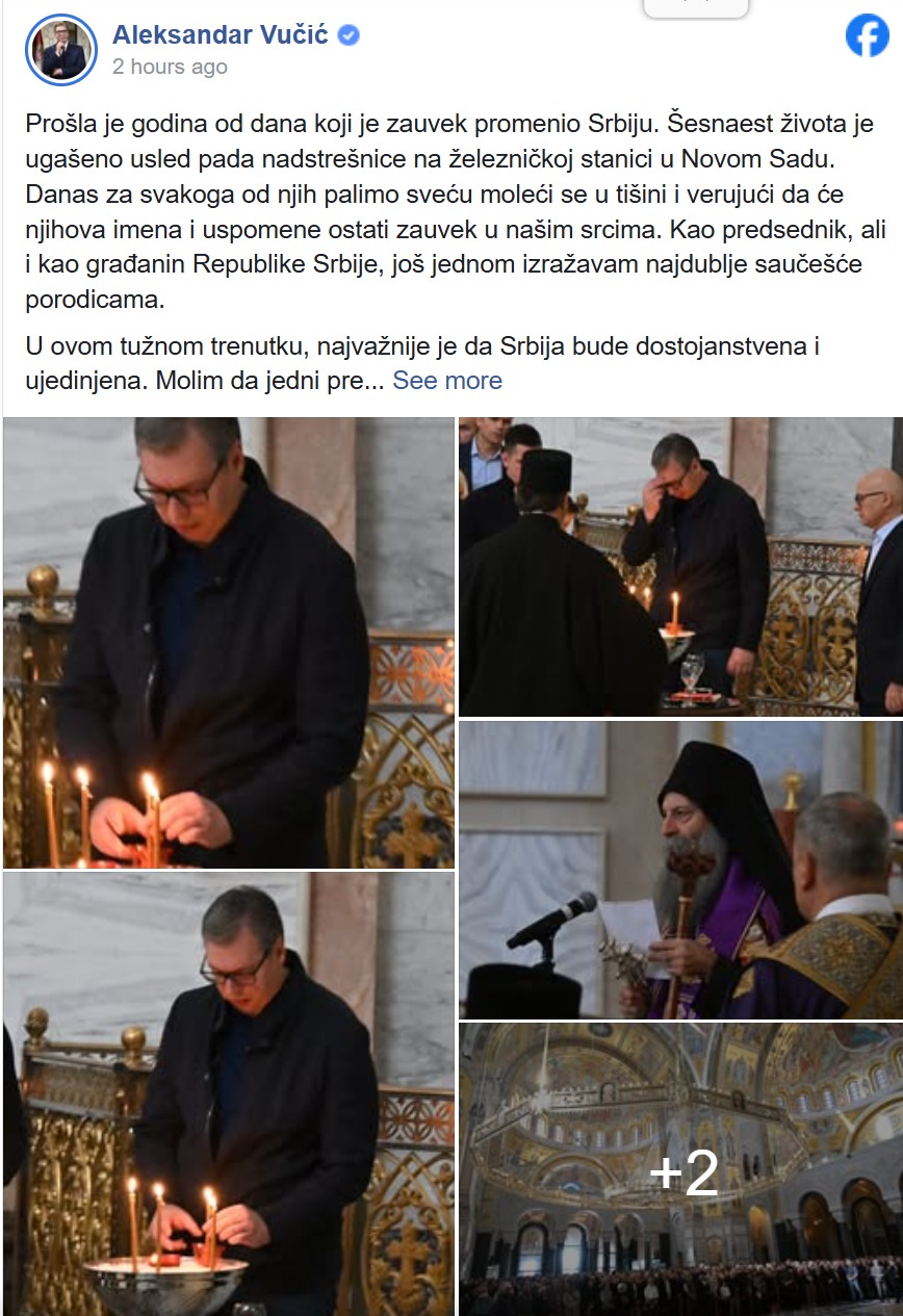 „A trecut un an de la ziua care a schimbat Serbia pentru totdeauna. 16 vieți au fost curmate din cauza prăbușirii unei copertine de la gara Novi Sad. Astăzi, aprindem câte o lumânare pentru fiecare dintre ei, rugându-ne în tăcere și crezând că numele și amintirile lor vor rămâne pentru totdeauna în inimile noastre.