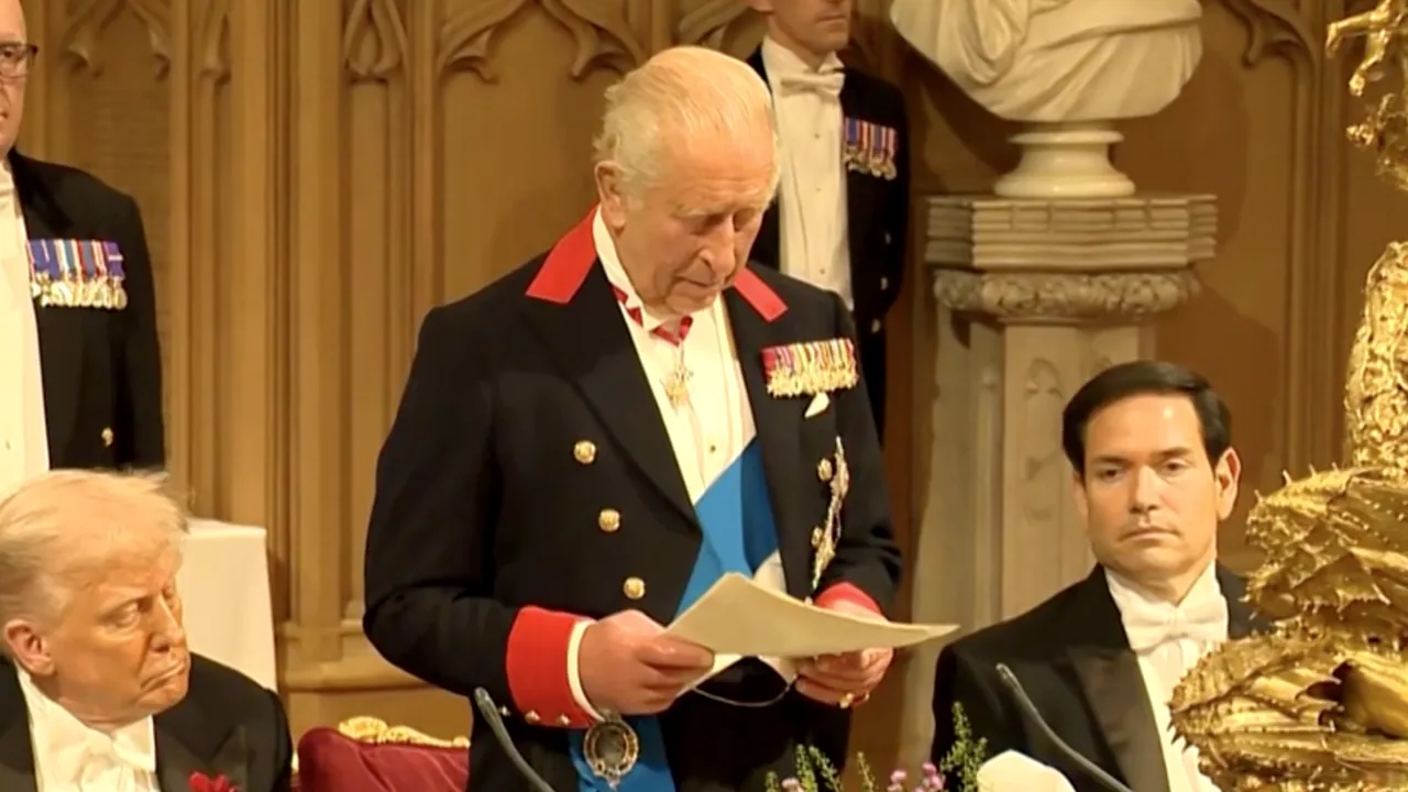 Avioanele Red Arrow au desenat dare roșii, albe și albastre pe cerul plumburiu de deasupra Castelului Windsor, în timp ce orchestra a cântat „Auld Lang Syne”, o melodie potrivită pentru președintele Trump, care îl descrie pe regele Charles ca pe un vechi prieten.