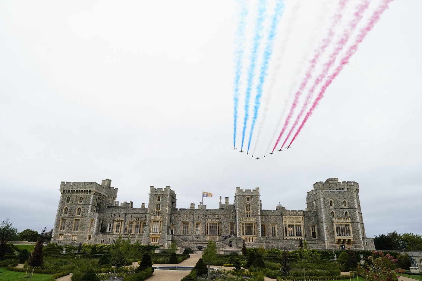 Parada comună planificată a avioanelor britanice și americane a fost redusă din cauza norilor care atârnau deasupra Castelului Windsor. Avioanele de luptă F-35 nu au mai participat, dar echipa de acrobație Red Arrow a fost prezentă.