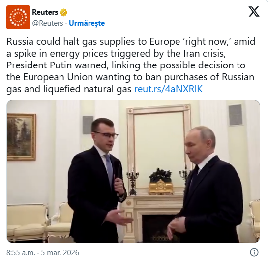 Vladimir Putin a declarat că Rusia ar putea lua în calcul oprirea livrărilor de gaze naturale către piețele europene și orientarea către alte piețe pe care le consideră mai promițătoare. Declarația vine în contextul în care Comisia Europeană pregătește o propunere legislativă prin care ar urma să fie interzise definitiv importurile de petrol rusesc.