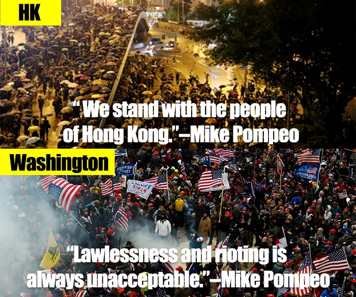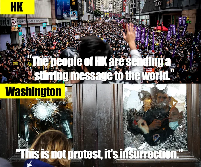 Pe Twitter, tabloidul naţionalist Global Times publică unele lângă altele fotografii cu intruziunea de la Capitoliu a susţinătorilor lui Donald Trump şi altele cu manifestanţi hongkongonezi în Legco. Cotidianul apropiat Partidului Comunist notează că manifestanţii din Hong Kong au fost calificaţi la acea dată drept „eroi” de către Nancy Pelosi, preşedinta Camerei Reprezentanţilor din Congresul SUA. „Rămâne de văzut dacă ea va spune acelaşi lucru în legătură cu situaţia din Capitoliu”, comentează ironic cotidianul.