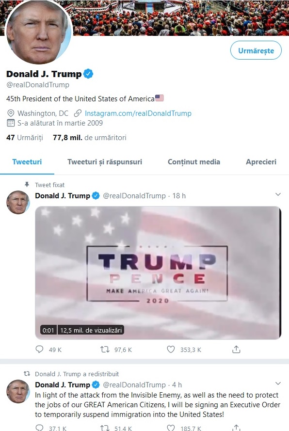 „În lumina atacului din partea «Inamicului Invizibil», ca şi a nevoii de a proteja locurile de muncă ale marilor noştri cetăţeni americani, voi semna un ordin executiv pentru suspendarea temporară a imigraţiei în Statele Unite”, a transmis Donald Trump pe Twitter. Preşedintele Americii nu a dorit să ofere alte detalii despre modul în care va fi aplicată această măsură şi nici pentru cât timp.