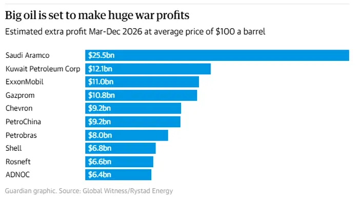 Aramco este, de departe, cel mai mare câștigător, estimându-se că va înregistra un profit de război de 25,5 miliarde de dolari în 2026, dacă prețul petrolului se va situa în medie la 100 de dolari. Aceasta se adaugă profiturilor uriașe înregistrate în mod obișnuit de compania saudită, deținută în majoritate de stat – 250 de milioane de dolari pe zi în perioada 2016-2023.