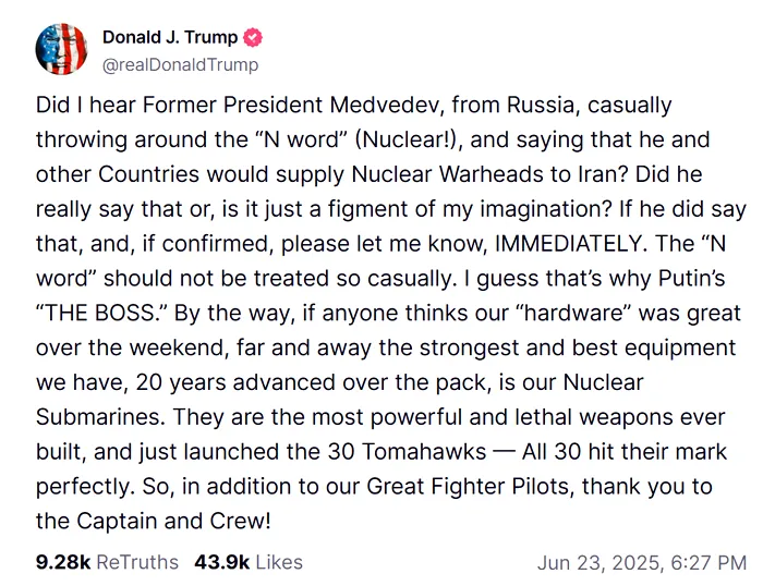 „Oare fostul președinte al Rusiei Medvedev tocmai a evocat cuvântul «nuclear»? A afirmat că el și alte țări ar putea furniza ogive nucleare Iranului? Chiar a spus acest lucru sau este doar un fragment al imaginației mele? Dacă a spus acest lucru, dacă se confirmă, să îmi spuneți imediat. Nu se poate discuta pur și simplu despre chestiunile nucleare. Bănuiesc că din acest motiv Vladimir Putin este șeful”, a subliniat Donald Trump.