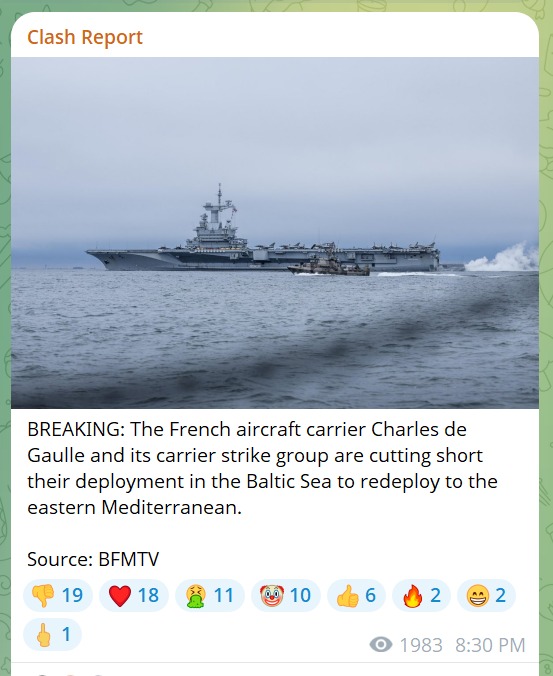 Franța își trimite portavionul Charles de Gaulle și grupul naval de luptă în estul Mării Mediterane pe fondul războiului regional din Orientul Mijlociu. Portavionul era staționat anterior în Marea Baltică.