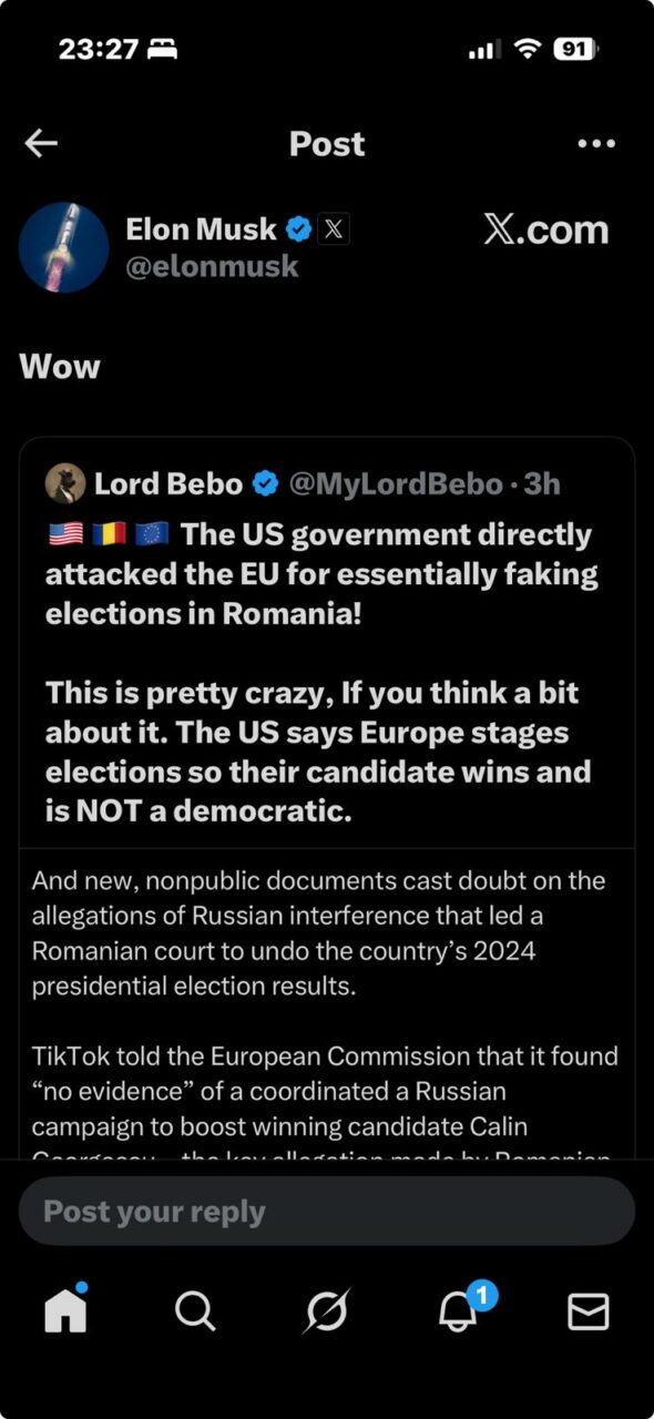 „Deci toată scuza „ingerinței Rusiei” folosită pentru anularea alegerilor din România din 2024? Se destramă. TikTok a declarat UE că nu a găsit nicio dovadă a unei campanii coordonate a Rusiei care să-l susțină pe Călin Georgescu. Această afirmație a fost folosită de autoritățile române pentru a bloca alegerile și a-l împiedica pe Georgescu să ajungă în al doilea tur.Acum se pare că activitatea de pe TikTok a provenit de la un alt partid politic românesc. Exact ceea ce te-ai aștepta de la un sistem care vine cu tot ce are nevoie pentru a opri candidații pe care nu îi poate controla.Și acum ce? Georgescu a câștigat primul tur. Vor repara dezastrul pe care l-au făcut? Știm deja răspunsul.”, a scris jurnalistul Mario Nawfal.