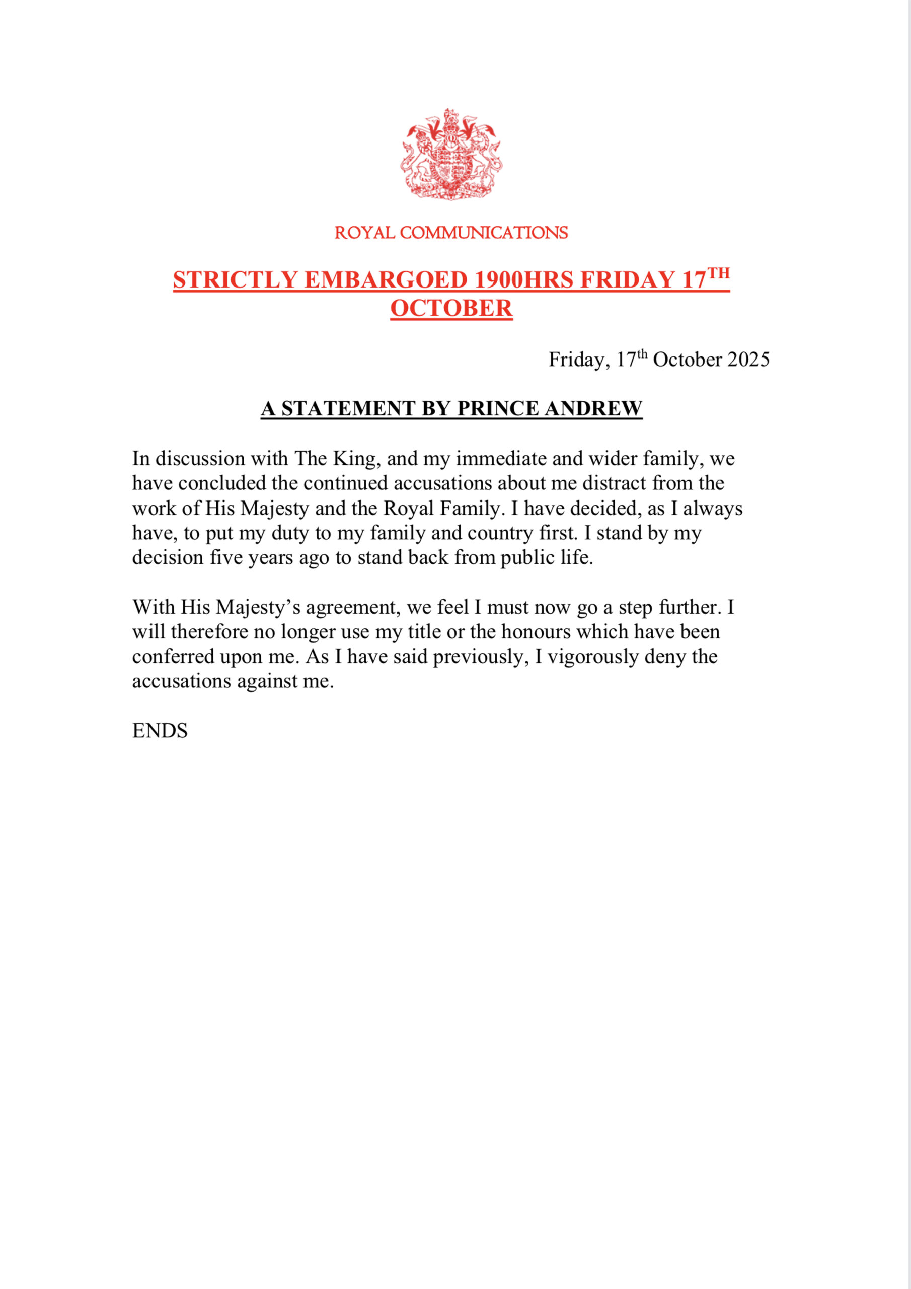„Majestatea Sa (Regele Charles-n.r.) a inițiat, joi, un proces formal de retragere a titlurilor și onorurilor prințului Andrew. Prințul Andrew va fi cunoscut de acum înainte sub numele de Andrew Mountbatten Windsor. Contractul său de închiriere pentru Royal Lodge i-a oferit până în prezent protecție legală pentru a continua să locuiască acolo.