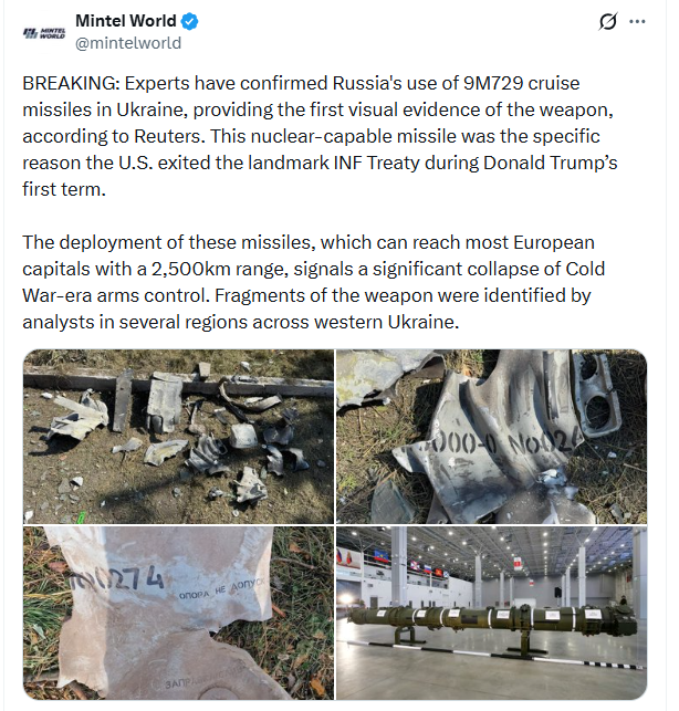 Potrivit unor surse oficiale de la Kiev și a unor analiști militari independenți, Rusia a lansat asupra Ucrainei rachete de croazieră 9M729, capabile să transporte atât încărcătură convențională, cât și încărcătură nucleară. Această rachetă l-a determinat pe Donald Trump, în 2019, să renunțe la Tratatul privind Forțele Nucleare cu Rază Intermediară de Acțiune (INF), pe atunci o piatră de temelie a controlului armelor nucleare, scrie Reuters.