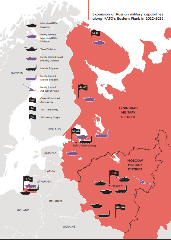 Rusia își extinde unitățile militare la granița cu statele NATO și le oferă experiență de luptă în Ucraina, ceea ce le-ar face eficiente în cazul unui conflict cu țările europene. În raportul publicat de serviciile de informații din Lituania, Rusia urmărește înclinarea balanței de putere în favoarea sa, precum și subjugarea totală a Ucrainei.