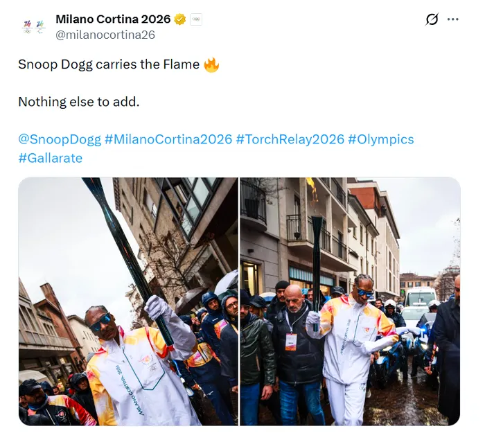 Înaintea Jocurilor Olimpice de Iarnă, care urmează să înceapă oficial pe 6 februarie, torța olimpică a fost purtată în mod tradițional pe străzile din Milano, iar printre purtătorii torței s-a numărat, din nou, popularul rapper american Snoop Dogg.