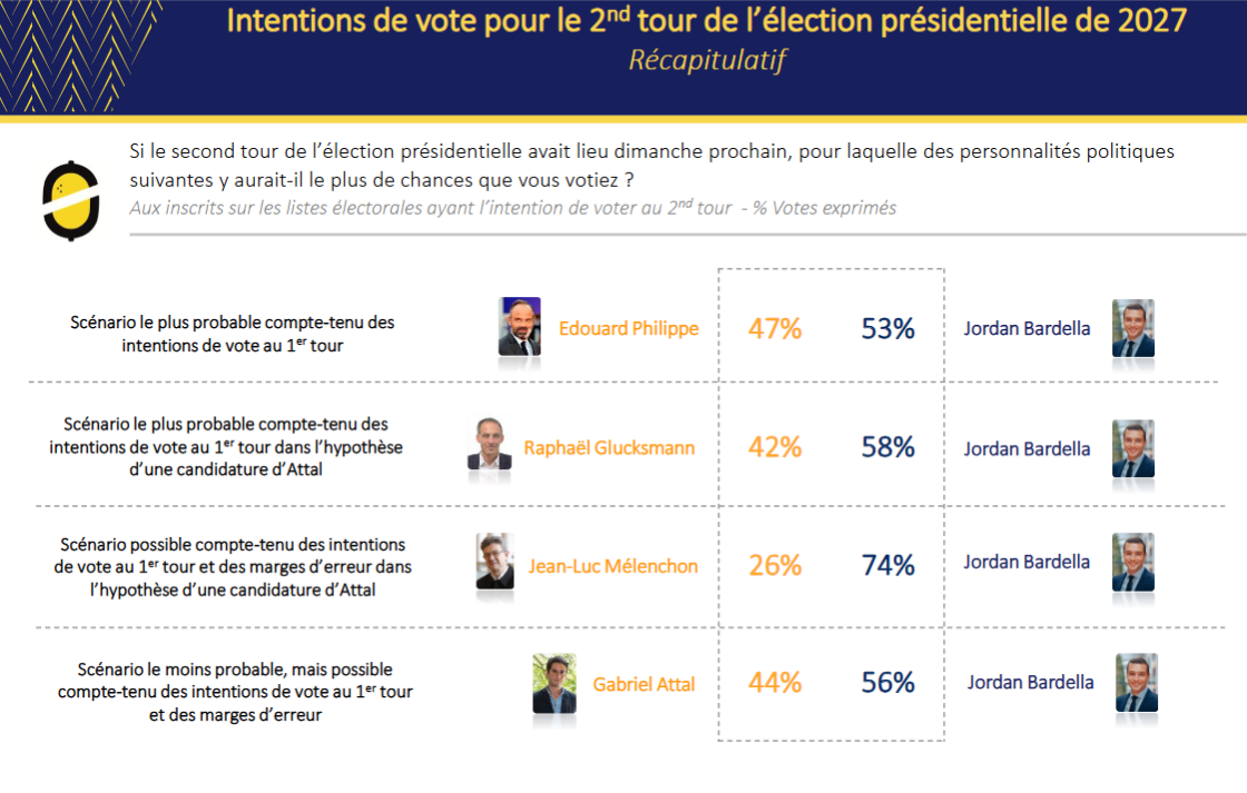 Noutatea acestui sondaj constă în proiecțiile pentru al doilea tur al alegerilor prezidențiale din 2027, unde Bardella ar urma să câștige împotriva tuturor candidaților.