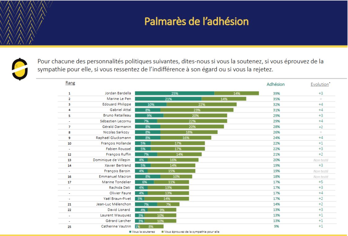 Sondajul Odoxa și Mascaret, realizat pe 19 și 20 noiembrie 2025, îl plasează pe Bardella în fruntea indicilor de popularitate, cu 39% opinii favorabile, cu trei puncte procentuale mai mult decât în octombrie.