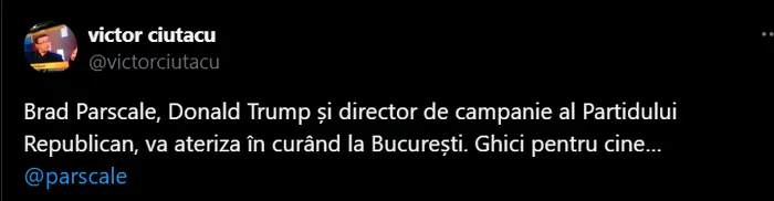 „Brad Parscale, managerul de campanie al lui Donald Trump și al Partidului Republican, va ateriza în curând la București. Ghiciți pentru cine…”, a scris Victor Ciutacu.
