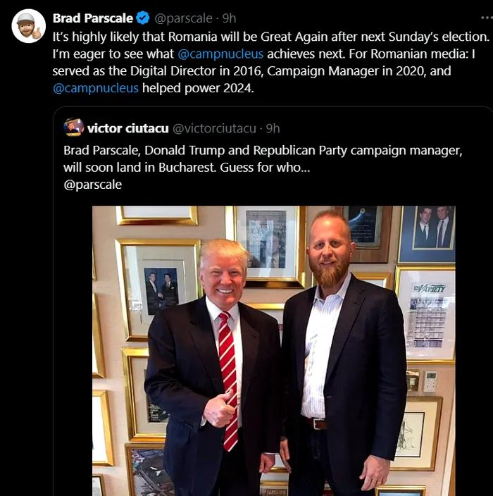 „Este foarte probabil ca România să devină măreață din nou după alegerile de duminica viitoare. Sunt nerăbdător să văd ce va realiza @campnucleus în continuare. Pentru presa din România: am fost director digital în 2016, manager de campanie în 2020, iar @campnucleus a sprijinit campania din 2024”, a scris Brad Parscale pe X.