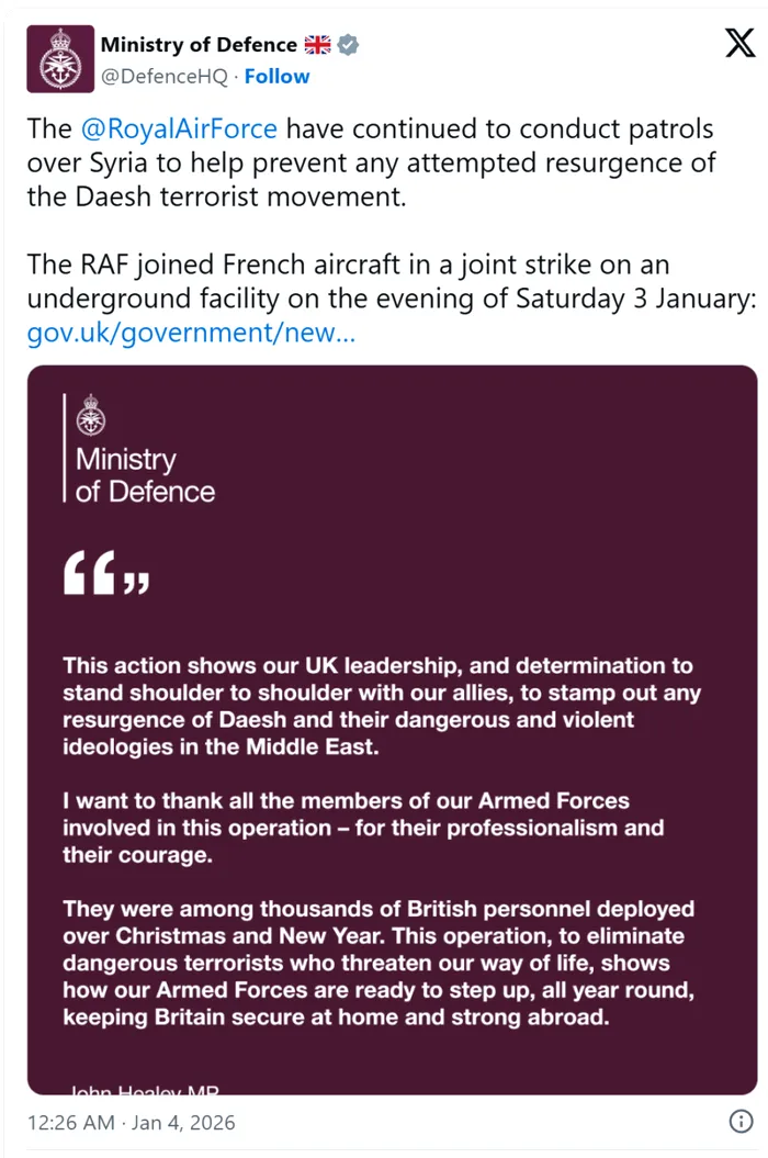 Sâmbătă seara, aeronavele RAF Typhoon FGR4 au lansat bombe ghidate Paveway IV, acestea având mare precizie în a lovi tunelurile de acces care duceau la instalația grupării teroriste.Ministerul britanic al Apărării transmite că a pregătit forțele armate să intensifice eforturile de război împotriva ISIS pe tot parcursul anului 2026.