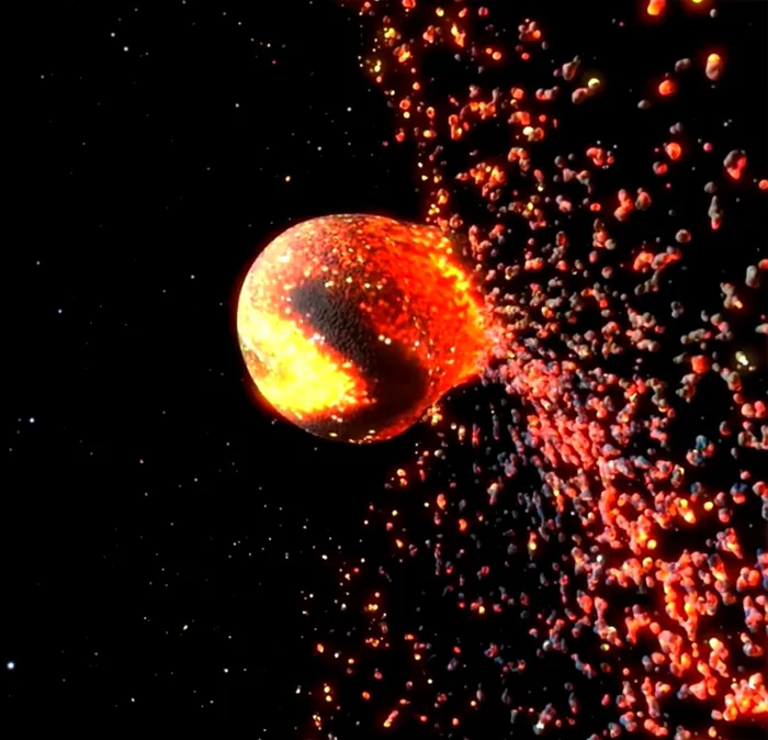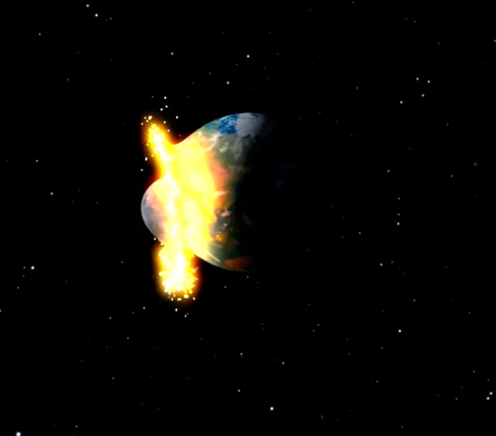 Roci și sedimente de praf vor fi aruncate pe orbita Terrei. Pământul devine o planetă de „magmă”, dar își recăpăta forma sferică inițială datorită gravitației.