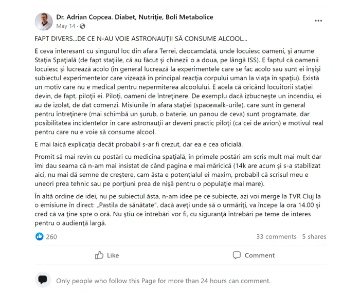 „Mai schimbă un şurub, o baterie, un panou de ceva, sunt programate, dar posibilitatea incidentelor în care astronauţii ar deveni practic piloţi (ca cei de avion) e motivul real pentru care nu e voie să consume alcool”, mai explică medicul pe pagina sa de Facebook.