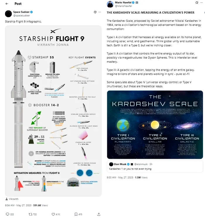 Miliardarul a citat o postare cu modelul de rachetă Starship Flight 9 ilustrat printr-un infografic, precum și o postare a lui Mario Nawfal privind Scara Kardashev care măsoară nivelul de dezvoltare tehnologică și necesarul de energie pe care îl poate consuma.