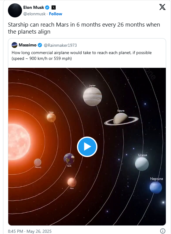 Șeful DOGE (Departamentul pentru Eficiență Guvernamentală) a mai scris că o rachetă Starship lansată de pe Pământ poate ajunge pe Marte în doar 6 luni, dar numai la un interval de 26 luni când planetele se aliniază.
