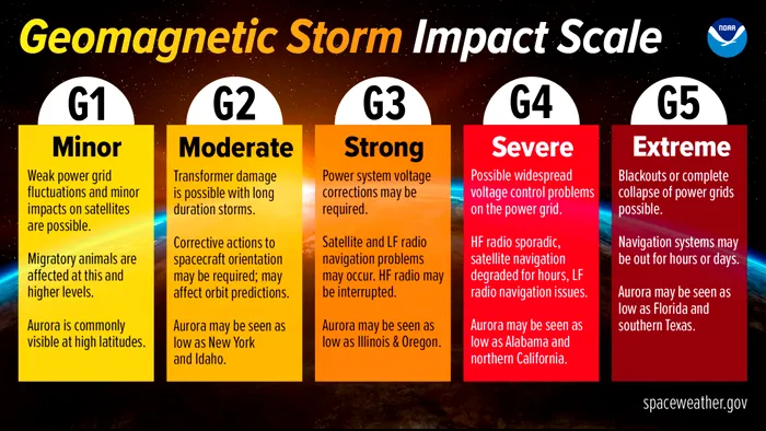 O furtună geomagnetică G4 (Severă spre Extremă) a lovit în luna mai Pământul, dar nu au fost raportate daune severe. În 1859, o furtună geomagnetică G5 (Extremă) provocată de erupția unei uriașe pete solară a distrus aproape toată rețeaua de telegrafie la nivel global. Mai jos puteți vedea scara furtunilor geomagnetice, de la G1 la G5.