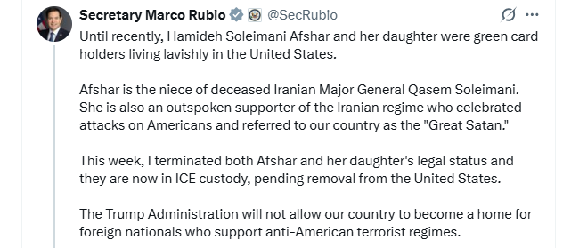Potrivit comunicatului prezentat pe site-ul Departamentului de Stat, Marco Rubio le-a revocat statutul de rezident permanent legal în SUA lui Hamideh Soleimani Afshar și al fiicei sale. Cu toate acestea, fiica lui Soleimani a numit afirmațiile Departamentului de Stat ca fiind false, spunând că persoanele arestate „nu au nicio legătură” cu tatăl ei.