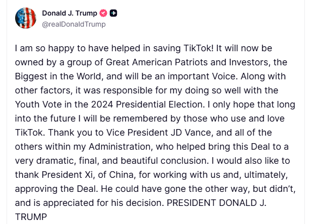 Într-o postare pe rețelele de socializare joi seară, Trump i-a mulțumit președintelui Chinei, Xi Jinping, „pentru că a colaborat cu noi și, în cele din urmă, pentru că a aprobat Acordul”. „Sunt atât de fericit că am ajutat la salvarea TikTok! Acum va fi deținută de un grup de mari patrioți și investitori americani, cei mai mari din lume, și va fi o voce importantă”, a scris președintele.