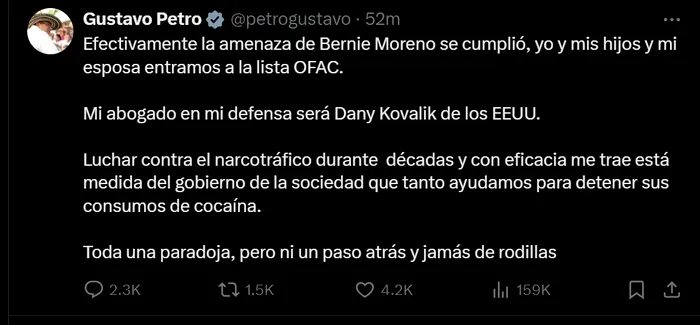„Soția mea, copiii mei și cu mine am fost plasați pe lista OFAC. Avocatul meu va fi Dany Kovalik din Statele Unite.Combaterea eficientă a traficului de droguri timp de decenii îmi aduce susținere din partea societății pe care am ajutat-o atât de mult să oprească consumul de cocaină. Un paradox destul de mare, dar fără niciun pas înapoi și niciodată în genunchi,”, a mai spus președintele columbian.