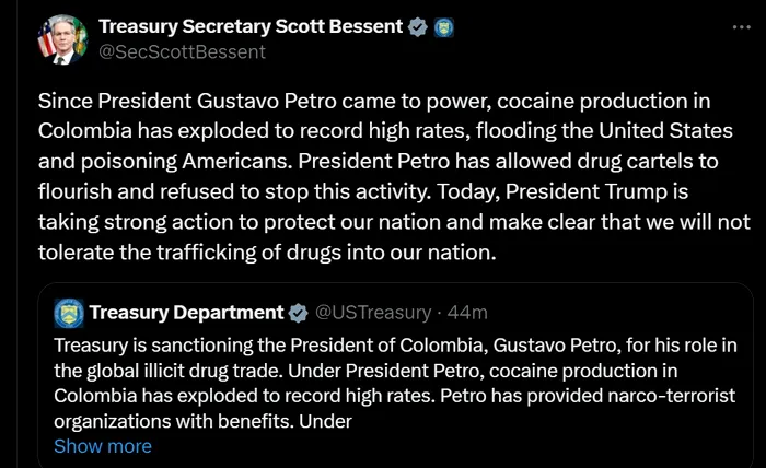 Scott Bessent, secretarul Trezoreriei din SUA, a anunțat că SUA au impus sancțiuni președintelui Columbiei, Gustavo Petro, și a familiei sale. Administrația Trump îl acuză pe președintele columbian că de când a ajuns la putere, producția de cocaină a explodat la nivel record.