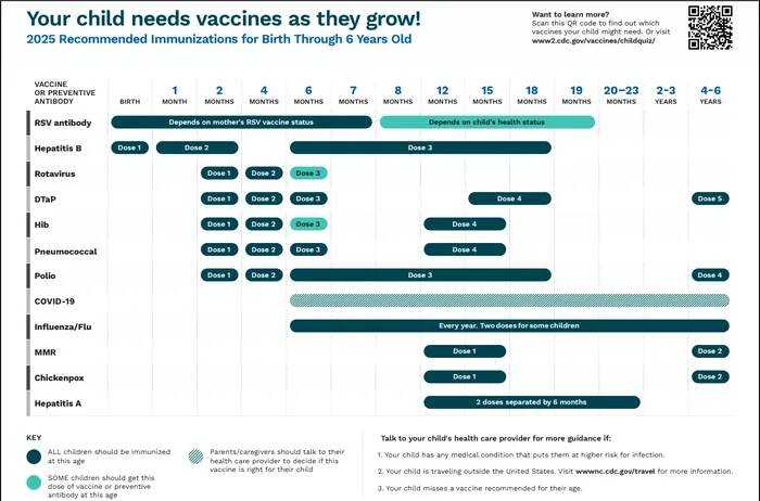 În prezent pe site-ul oficial al Centrului pentru Controlul și Prevenirea Bolilor (CDC) include 11 boli menite a fi prevenite prin vaccinare în rândul copiilor cu vârste între 0-6 ani.