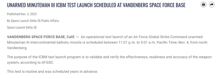 Statele Unite vor face miercuri, 5 noiembrie, primul test cu racheta balistică intercontinentală Minuteman III,  capabilă să transporte o încărcătură nucleară. Lansarea va avea loc la baza Vandenberg a Forțelor Spațiale ale SUA, se artă în comunicatul de pe site-ul bazei americane. Testul cu racheta Minuteman III este programat între orele 23:01  și 5:01, ora Pacificului, pe 4 noiembrie (5 noiembrie, între orele 09:01 și 15:01 pe fusul orar al României). Testul se va face fără încărcătură nucleară.
