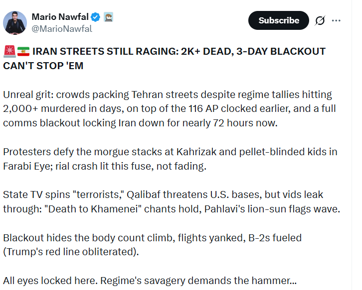 Influencerul Mario Nawfal susține că ar fi 2.000 de morți în urma represiunii violente a protestatarilor în Iran.
