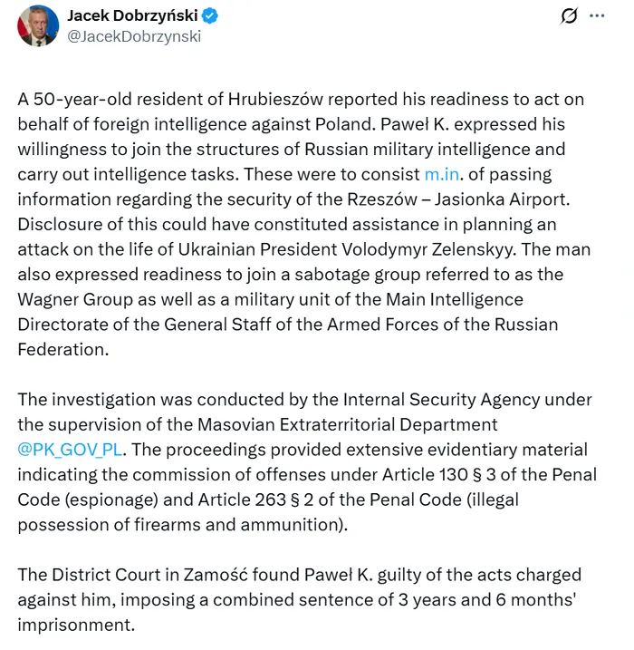 Mai mult, polonezul și-a arătat disponibilitatea de a se alătura grupării de mercenari Wagner și a unității militare a Direcției Principale de Informații a Rusiei – GRU. Autoritățile poloneze l-au găsit vinovat pe acesta de spionaj în favoarea altui stat și urmează să execute o pedeapsă de 3 ani și 6 luni de închisoare. Bărbatul credea cu tărie în ideea Uniunii Sovietice, motiv pentru care Moscova l-a recrutat în scopuri proprii.