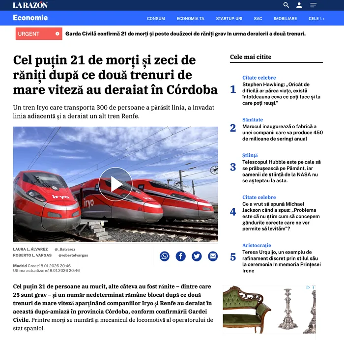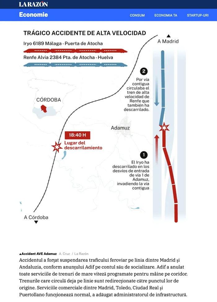 ȘTIREA INIȚIALĂ. Un grav accident feroviar a avut loc duminică seara în localitatea Adamuz, provincial Córdoba, după ce două trenuri de mare viteză s-au ciocnit. Incidentul s-a produs în urma unei probleme la un macaz în zona Adamuz.