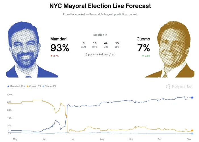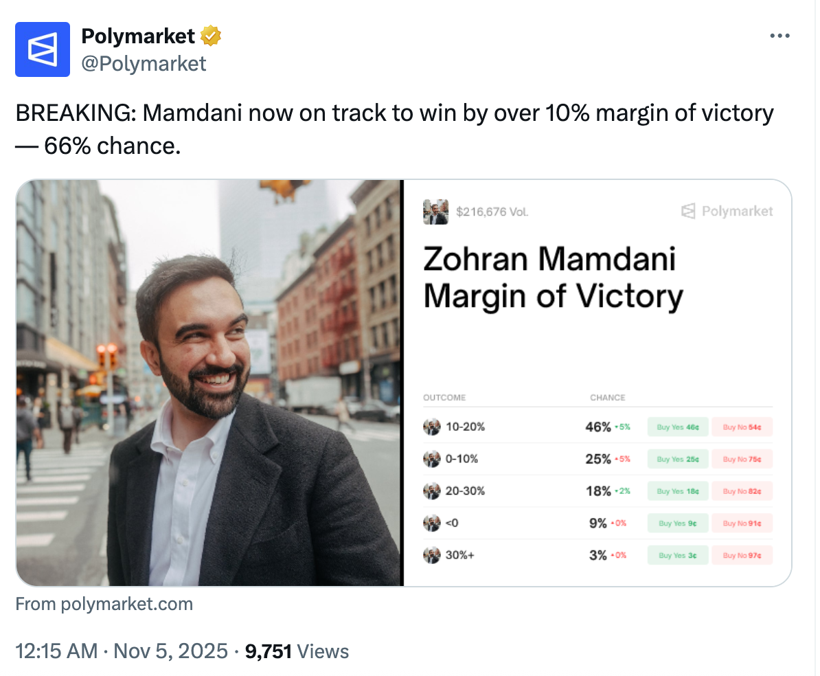 Zohran Mamdani este pe cale să câștige primăria NY cu o diferență de peste 10% de următorul clasat — probabilitatea este de 66%.