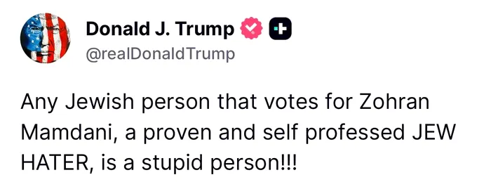 Președintele american Donald Trump, care este vizibil speriat de o victorie a lui Mamdani,  a scris pe platforma Truth Social „că orice evreu care votează pentru Mamdani este „o persoană proastă”.