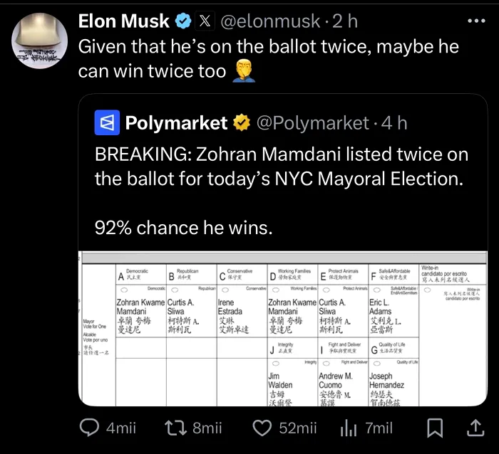 Miliardarul Elon Musk, care la rândul său i-a îndemnat pe newyorkezii republicani să-l voteze pe Andrew Cuomo, care e un democrat liberal progresist clasic, se teme de victoria lui Mamdani.