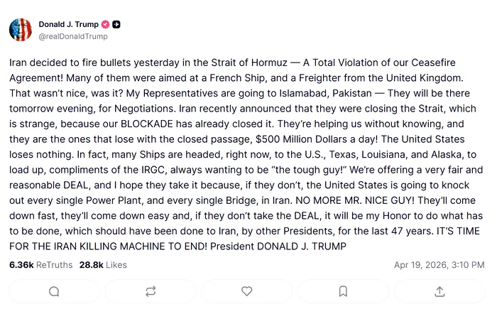 „Iranul a decis ieri să tragă cu gloanțe în Strâmtoarea Hormuz – o încălcare totală a Acordului nostru de încetare a focului! Multe dintre ele au fost îndreptate spre o navă franceză și un cargou din Regatul Unit. Nu a fost frumos, nu-i așa? Reprezentanții mei merg la Islamabad, Pakistan – Vor fi acolo mâine seară, pentru negocieri. Iranul a anunțat recent că închide strâmtoarea, ceea ce este ciudat, pentru că BLOCADA noastră a închis-o deja. Ne ajută fără să știe și ei sunt cei care pierd odată cu blocarea culoarului, 500 de milioane de dolari pe zi! Statele Unite nu pierd nimic. De fapt, multe nave se îndreaptă, chiar acum, spre SUA, Texas, Louisiana și Alaska, pentru a se încărca, sub îndrumarea IRGC, dorind mereu să fie „tipii duri!”. Oferim o AFIRMAȚIE foarte corectă și rezonabilă și sper că o vor accepta, pentru că, dacă nu o fac, Statele Unite vor dărâma fiecare centrală electrică și fiecare pod din Iran. GADA CU DOMNUL DRĂGUȚ! Vor veni repede, vor veni ușor și, dacă nu acceptă ACORDUL, va fi o onoare pentru mine să fac ceea ce trebuie făcut, ceea ce ar fi trebuit făcut Iranului, de către alți președinți, în ultimii 47 de ani. E TIMPUL CA MAȘINARIA DE UCIGAȘI A IRANULUI SĂ SE TERMINE!”