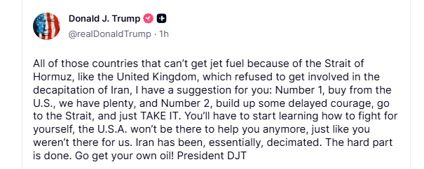 „Adună-ți curajul, mergi în strâmtoare și pur și simplu IA-L [petrolul]. Va trebui să începi să înveți cum să lupți pentru tine, SUA nu vor mai fi acolo să te ajute, așa cum nu ai fost acolo pentru noi”, a postat Trump.
