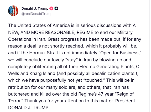 Donald Trump a anunțat pe Truth Social că Statele Unite se află în discuții serioase cu un regim mai rezonabil de la Teheran dar, în același timp, a amenințat că va distruge toate centralele electrice ale sondelor de petrol, dar și insula Kharg, crucială pentru industria petrolieră a Iranului.