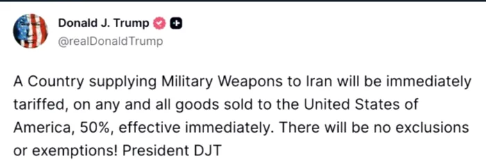 „O țară care a aprovizionat Iranul cu arme va fi imediat sancționată, asupra tuturor produselor vândute în Statele Unite ale Americii, cu 50%, cu efect imediat. Nu vor exista excepții!”, a scris Trump pe Truth Social.