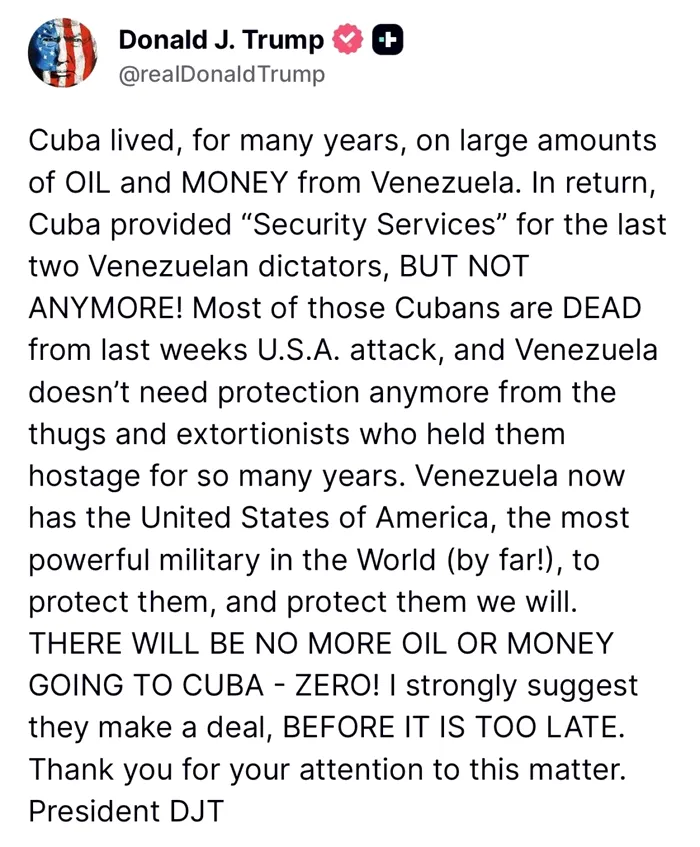 Cuba a trăit pentru mai mulți ani pe o mare adunătură de bani și petrol provenit din Venezuela. La schimb, Cuba le-a asigurat ultimilor doi dictatori servicii de securitate, dar gata de acum. Cei mai mulți cubanezi sunt morți după atacul SUA din ultima săptămână, iar Venezuela nu mai are nevoie de protecție niciodată din partea hoților și șantajiști care o țineau ostatică de mulți ani. Venezuela are de partea ei Statele Unite ale Americii, cea mai mare puter mlitară din lume pentru a o proteja și noi o vom proteja. Nu va ma ifi petrol și bani care să se ducă către Cuba – ZERO! Le sugerez să facem o înțelegere. REPEDE înainte să fie prea TÂRZIU.