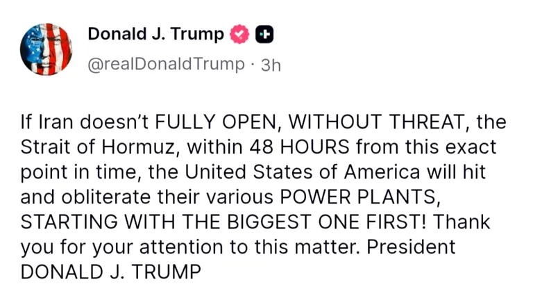 „Dacă Iranul nu deschide complet, fără amenințări, Strâmtoarea Ormuz în termen de 48 de ore de la acest moment exact, Statele Unite ale Americii vor lovi și vor distruge complet diversele lor centrale electrice, începând cu cea mai mare”, a scris Donald Trump.