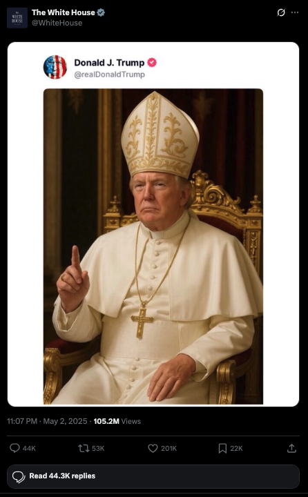 Trump s-a ilustrat recent ca Mesia într-o imagine generată cu AI postată pe Truth Social. Anul trecut, după decesul Papei Francisc, președintele a postat o imagine generată cu AI în care se poza în veșminte papale.