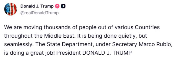Președintele a anunțat pe Truth Social că mii de cetățeni americani au fost evacuați în siguranță din țările arabe atacate de Iran.