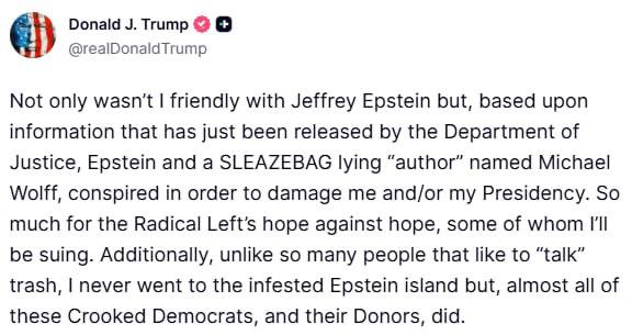 „Nu doar că n-am fost prieten cu Jeffrey Epstein, dar, pe baza informațiilor publicate de Departamentul Justiției, Epstein și autorul ticălos mincinos numit Michael Wolff, a conspirat pentru a-mi periclita preșdinția.  Prea mult pentru Stânga Radicală care speră, unii dintre aceștia vor fi dați în judecată. Pe lângă asta, spre deosebire de foarte mulți oameni care vorbesc gunoaie, nu am fost niciodată pe insula infectă a lui Epstein, dar au fost toți Democrații Corupți și Donatorii lor.”, a scris Trump pe Truth Social.