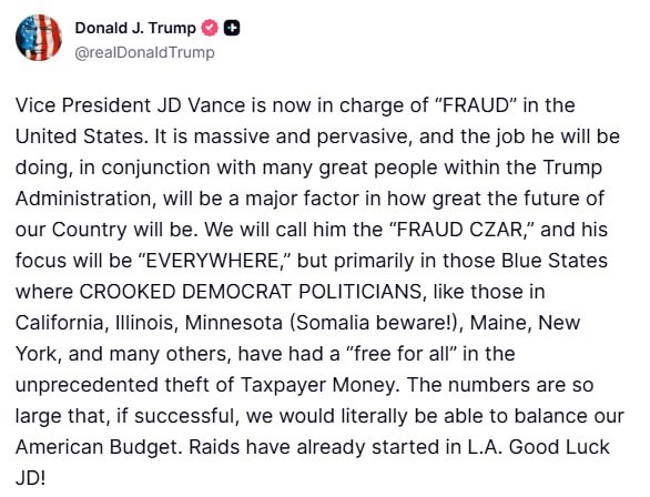 „Îi vom spune ȚARUL FRAUDEI și își va concentra atenția peste tot, dar mai ales în Statele Albastre unde politicienii corupți democrați, precum cei din California, Illinois, Minnesota (Somalia, ești atenționată!), Maine, New York și multe altele, au avut avea mână liberă în cel mai mare jaf al banilor contribuabililor fără precedent. Numerele sunt atât de mari, că dacă va avea succes, va putea echilibra bugetul American. Primele raiduri vor începe în Los Angele. Noroc JD!”.