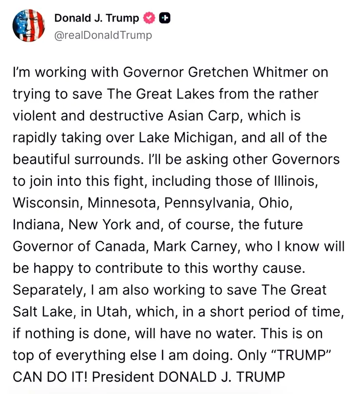 „Lucrez cu guvernatorul Gretchen Whitmer în încercarea de a salva Marile Lacuri de la crapii asiatici violenți și distructii, care au preluat controlul asupra Lacului Michigan și al împrejurimilor frumoase. Îl rog pe guvernator să ni se alăture în această luptă, înclusiv pe guvernatorii statelor Illinois, Wisconsin, Minnesota, Pennsylvania, Ohio, Indiana, New York și, desigur, pe viitorul guvernator al Canadei, Mark Carney, despre care știu că va fi fericit să contribuie la această cauză demn de luat în seamă.