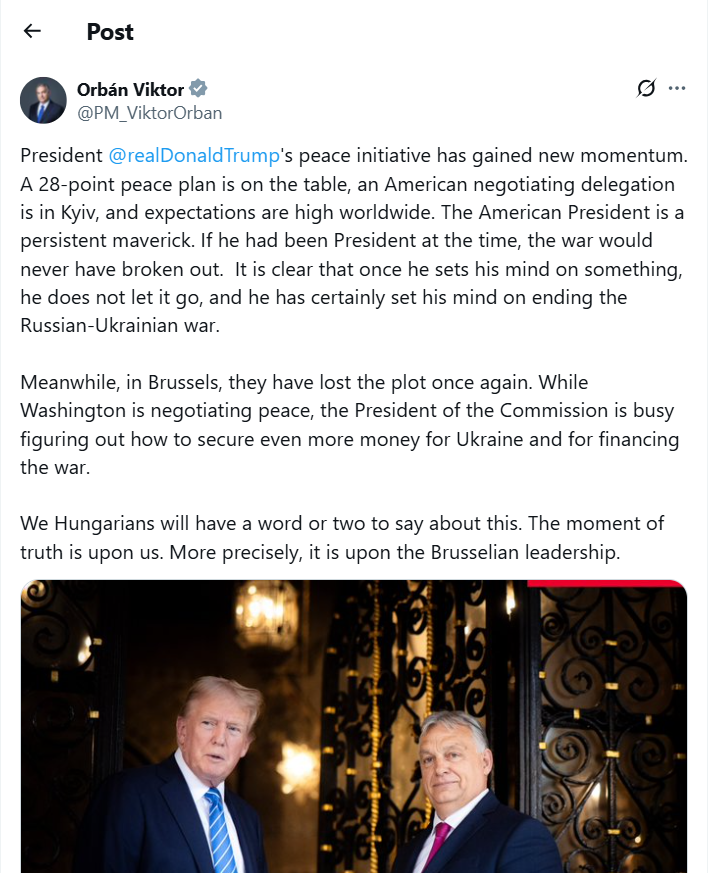 „Inițiativa de pace a președintelui DonaldTrump a prins un nou avânt. Un plan de pace în 28 de puncte este pe masă, o delegație americană de negocieri se află la Kiev, iar așteptările sunt mari la nivel mondial.
