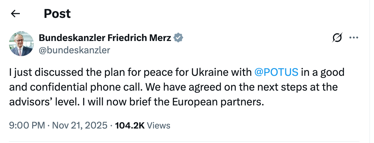 Tocmai am discutat un plan de pace pentru Ucraina cu @ POTUS [președintele SUA] într-o convorbire telefonică bună și confidențială.”